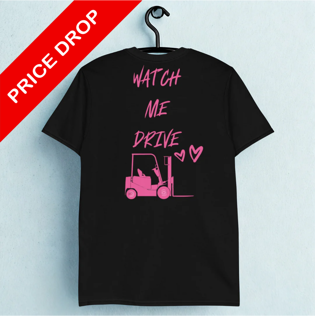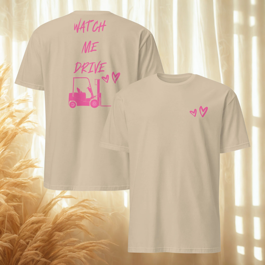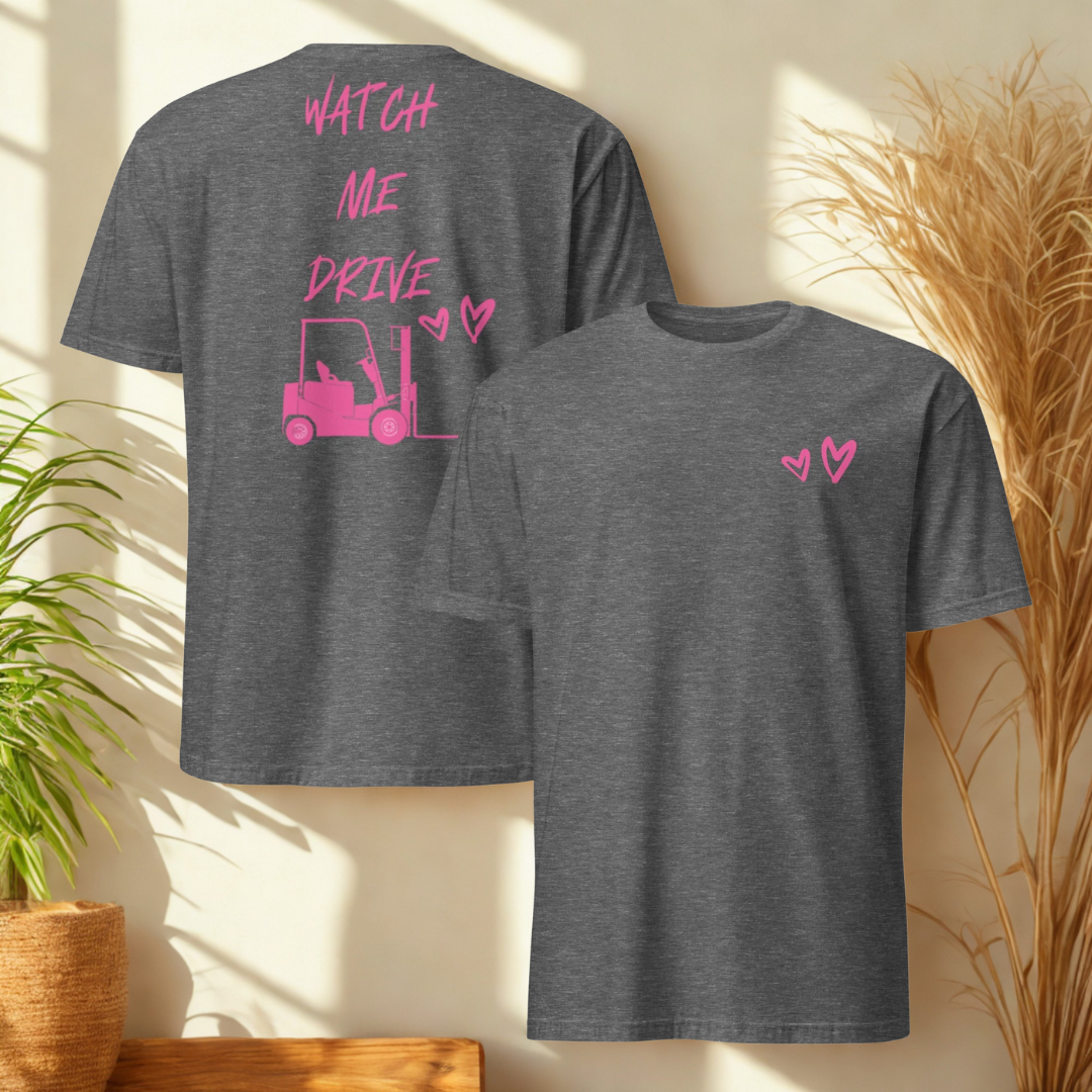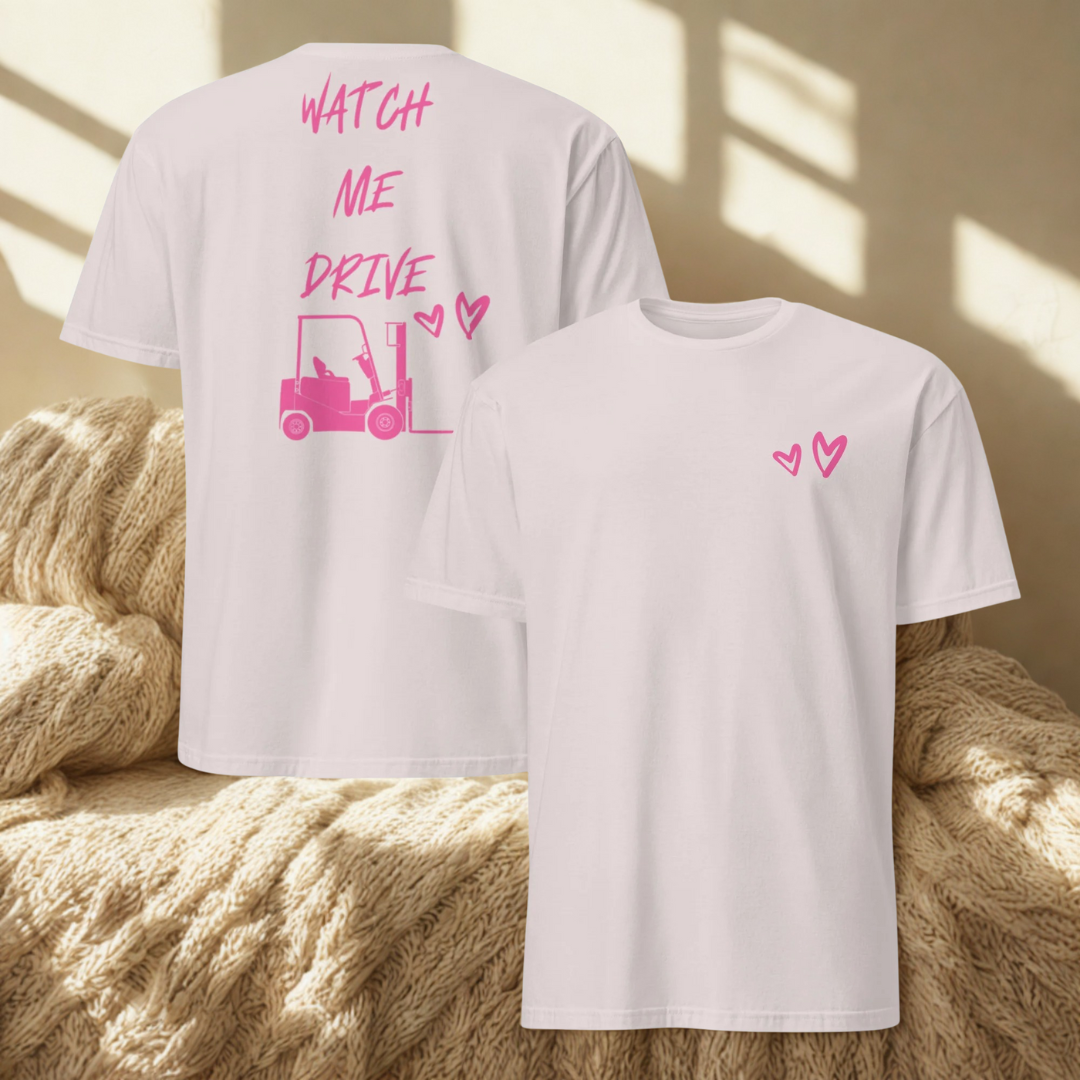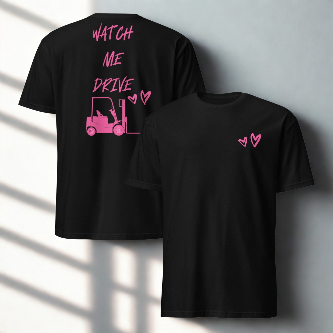 Show off your confidence and style with the Watch Me Drive tee — designed for hardworking women who move with purpose. This tee features a bold pink forklift graphic on the back and heart accents on the front, giving it the perfect mix of strength and charm.